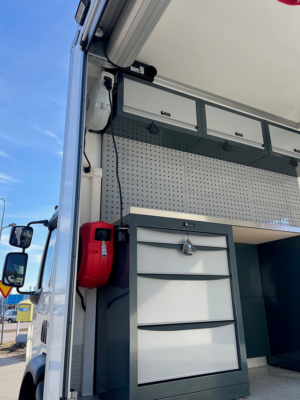 Siktpaket FE, Kollisionsvarningssystem inkl. nödbromssystem, Körfältsassistans, Extra sidoruta passagerar dörr, Komforthytt, Luftfjädrad hyttfjädring, Förarstol, komfort, Rostfri Takbåge med LED Extraljus & varningsljus, Gott om arbetsbelysningar & varningsljus runt om, Extra batteriladdare för underhålls laddning, Nya MaxiSign Online LED Skylt, Integrerad X5 ljuspil, Verdegro TMA kudde, Trådlös styrning av LED skylt & TMA Kudde, Extra blixtljus & Arbetsbelysningar monterade på TMA kudde, Rostfria Sidor, Skåp byggnation med jalusi med centrallås, Byggnationen är galvad, Riktigt flak med förankringsöglor & aluminiumlämmar med fotsteg, Höj/sänkbar Varningsljusramp, Eberspächer värmare i skåpet, Verkstadsinredning med belysning & gott om skåp mm, Inverter med 230V sladdvinda i skåpet, Luftvinda i skåpet, Tillåten Lastvikt: 6425 Kg, Totalvikt: 18 000 Kg, Axelavstånd: 3700 mm, Servicebil Däckservice TMA Bil Servicebil Vägservice Bärgare Bärgningsbil Tma-Bil Skyddsbil, En riktigt fin och genomtänkt byggnation som har det mesta du kan tänka dig, För mer info ring säljare Andreas 0705-494044
