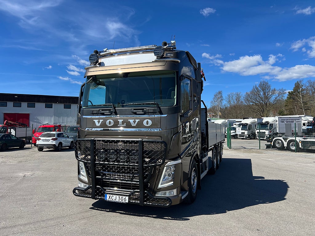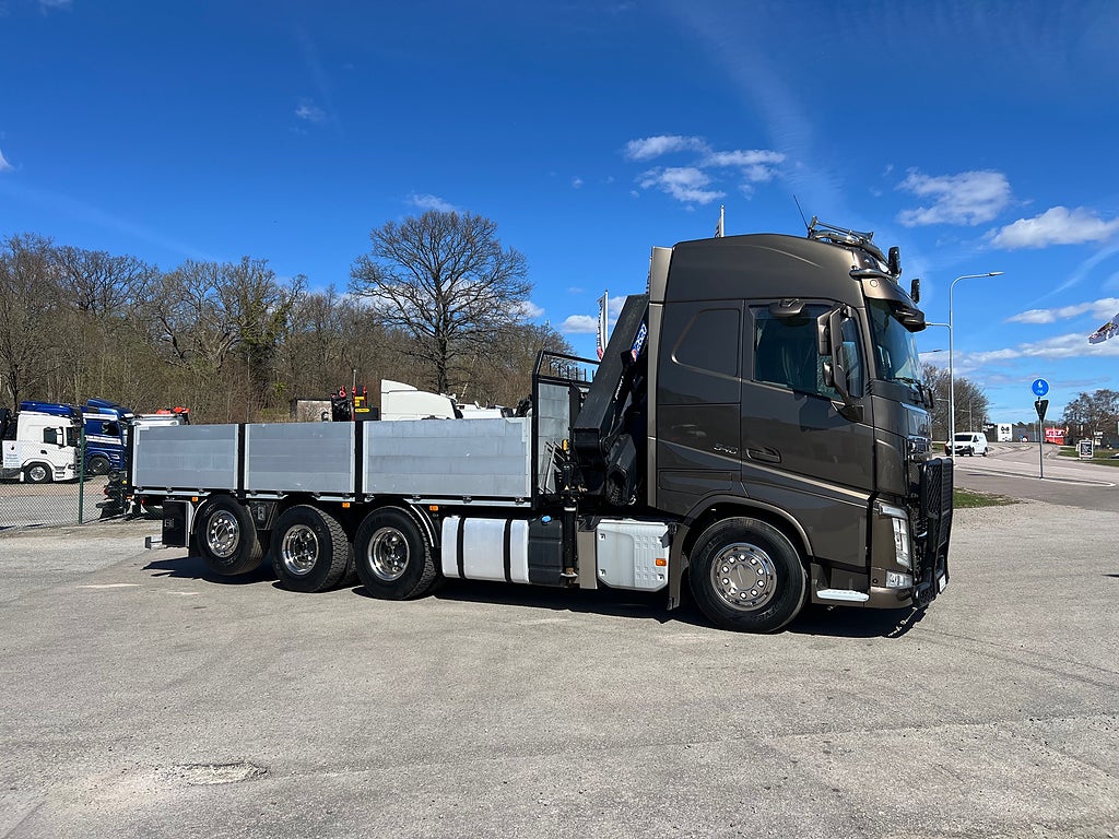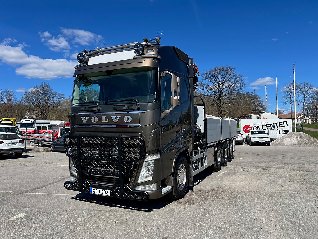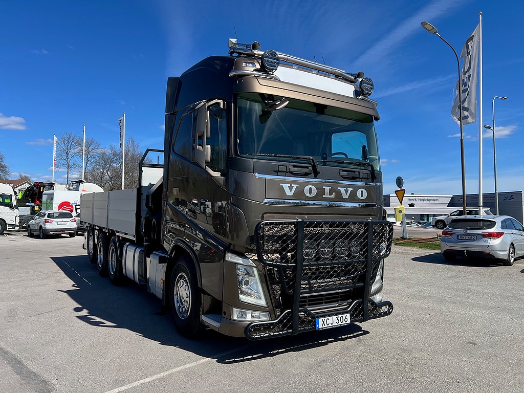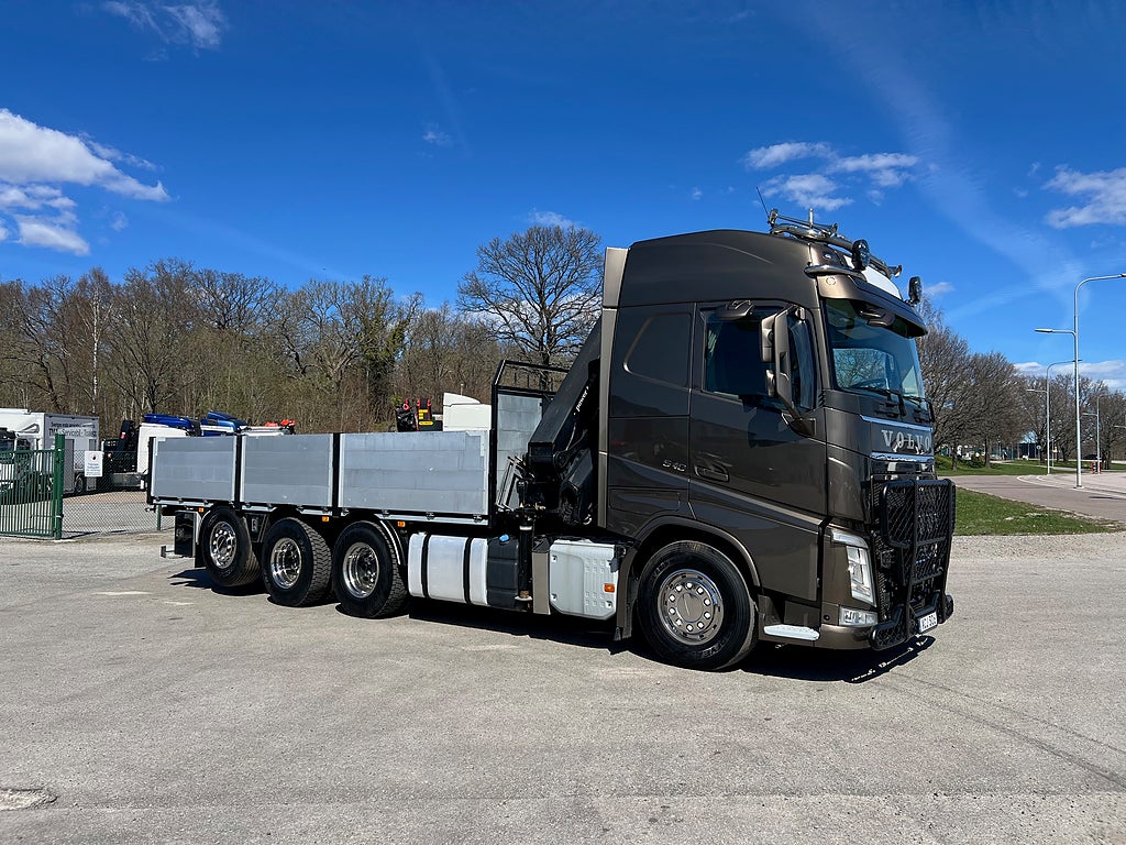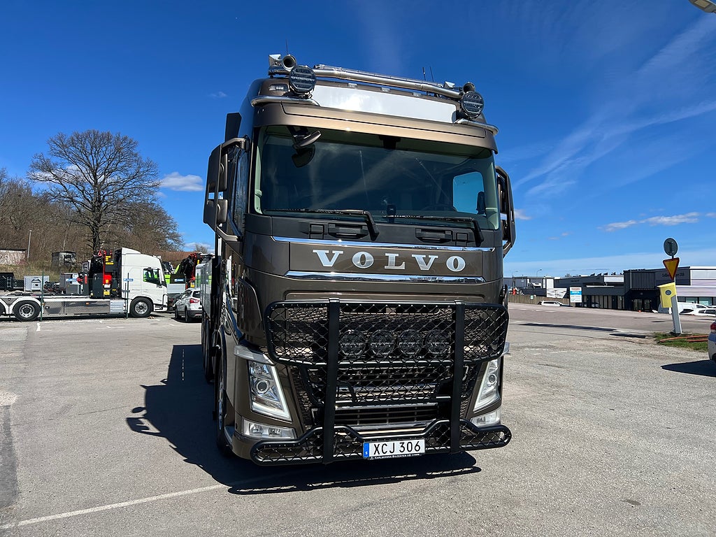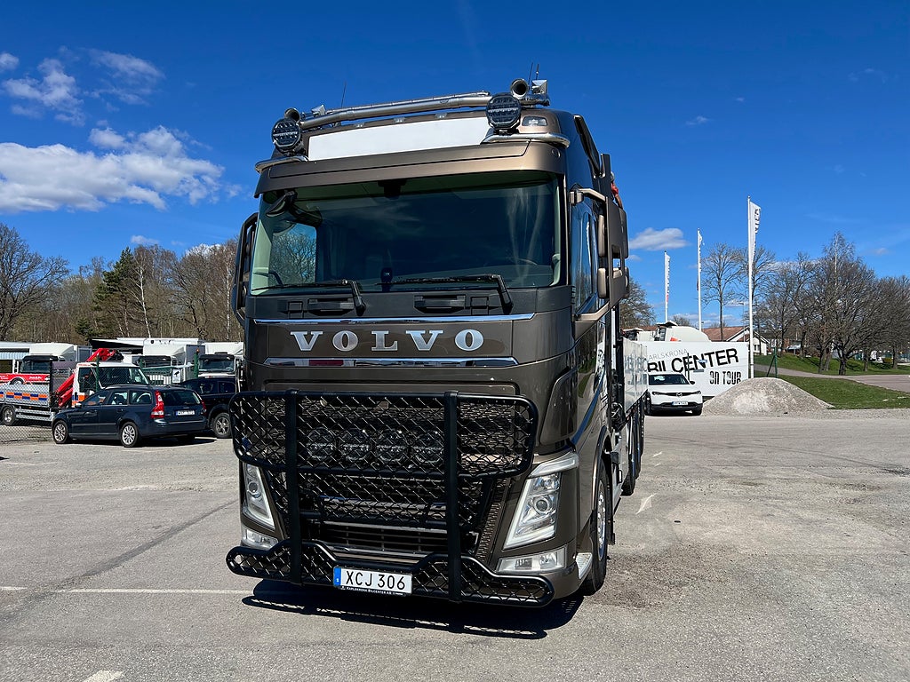 Förarpaket FH++, Siktpaket+, Extra hyttisolering FH Globetrotter, Interiör i mjuk textil i matchande grå/ beige toner stolklädsel i läder, Hög sovhytt FH (L2H2), Vil- och sovpaket Arctic+, Ljudpaket avancerat power, Taklucka i tonat glas elektrisk öppning, Extra ljudpaket 400 W slutsteg subwoofer, Multifunktionell fjärrkontroll, Brandvarnare, Elektronisk startspärr (immobilizer), Bi-Xenonlampor hel- och halvljus, Svart Älgstaket / Frontskydd med LED Extraljus, Assistansuppkoppling med mikrofon, TV-prep ovan vänster dörr, Förstärkt växellåda, 33 liters kylbox med frysdel under säng, Armstöd i läder, Stolklädsel läder i svart/grå färg, Bäddmadrass Premium, Luftfjädrad hyttfjädring, Vilstol sväng- och fällbar, Armstöd båda sidor förar- och passagerarstol, Förarstol lyx luftfjädrad med värme samt minnesfunktion, Kontrollpanel i sovhytt lyx, Boggielåda, Rostfri Takbåge med extraljus, HMF 2620 K7 Kran, 7 Stycken hydrauliska utskjut, Flakets invändiga mått är Längd: 651 Cm & Bredd: 247 Cm, Hjulbas 4100 mm, Tjänstevikt: 16 590 Kg, Tillåten Lastvikt: 15 410 Kg, Totalvikt: 32 000 Kg, Tågvikt: 70 000 Kg, Tridem Brädgårdsbil Kranbil Brädgårs bil Kran bil,
