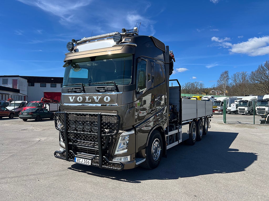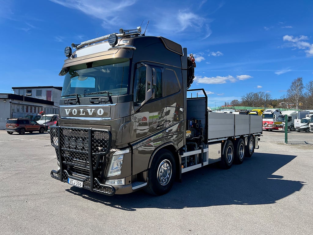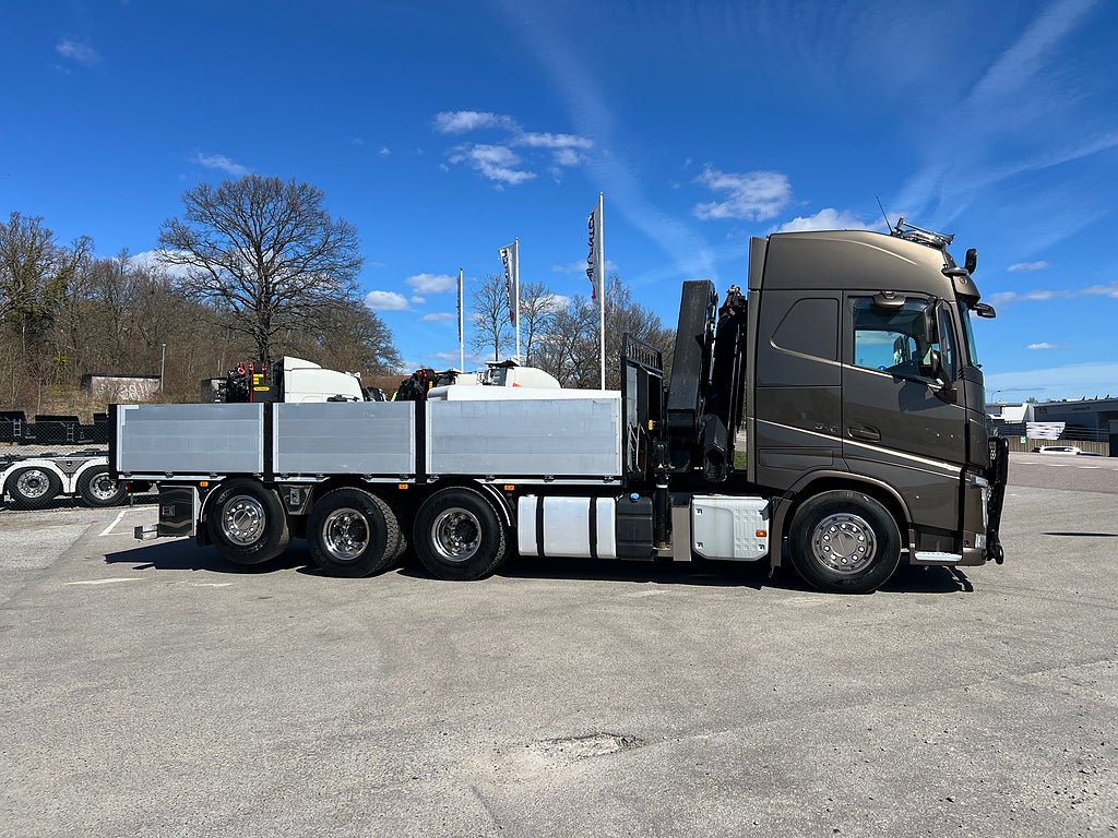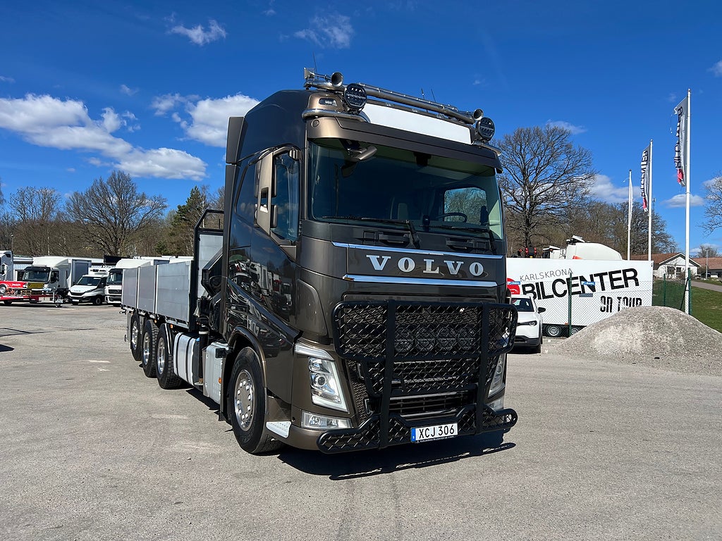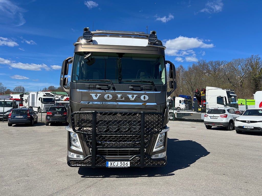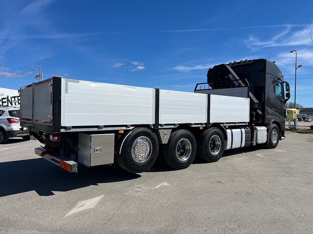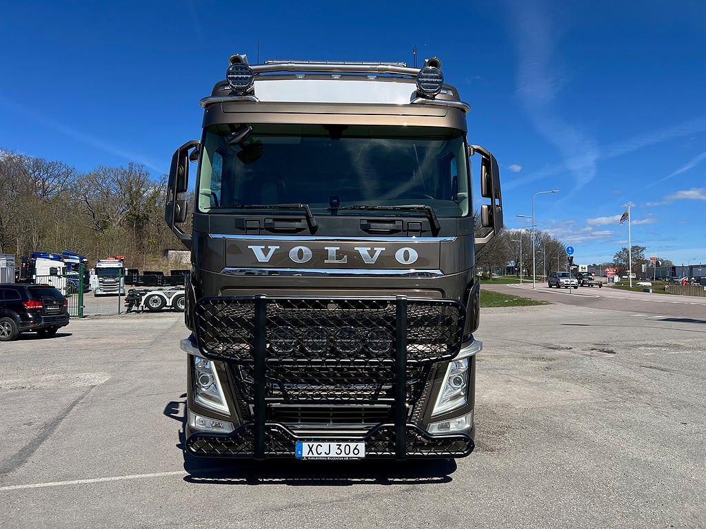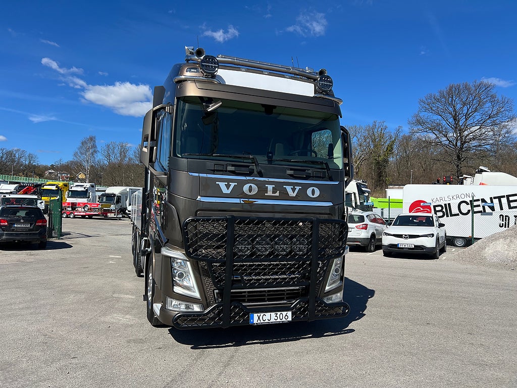 Förarpaket FH++, Siktpaket+, Extra hyttisolering FH Globetrotter, Interiör i mjuk textil i matchande grå/ beige toner stolklädsel i läder, Hög sovhytt FH (L2H2), Vil- och sovpaket Arctic+, Ljudpaket avancerat power, Taklucka i tonat glas elektrisk öppning, Extra ljudpaket 400 W slutsteg subwoofer, Multifunktionell fjärrkontroll, Brandvarnare, Elektronisk startspärr (immobilizer), Bi-Xenonlampor hel- och halvljus, Svart Älgstaket / Frontskydd med LED Extraljus, Assistansuppkoppling med mikrofon, TV-prep ovan vänster dörr, Förstärkt växellåda, 33 liters kylbox med frysdel under säng, Armstöd i läder, Stolklädsel läder i svart/grå färg, Bäddmadrass Premium, Luftfjädrad hyttfjädring, Vilstol sväng- och fällbar, Armstöd båda sidor förar- och passagerarstol, Förarstol lyx luftfjädrad med värme samt minnesfunktion, Kontrollpanel i sovhytt lyx, Boggielåda, Rostfri Takbåge med extraljus, HMF 2620 K7 Kran, 7 Stycken hydrauliska utskjut, Flakets invändiga mått är Längd: 651 Cm & Bredd: 247 Cm, Hjulbas 4100 mm, Tjänstevikt: 16 590 Kg, Tillåten Lastvikt: 15 410 Kg, Totalvikt: 32 000 Kg, Tågvikt: 70 000 Kg, Tridem Brädgårdsbil Kranbil Brädgårs bil Kran bil,