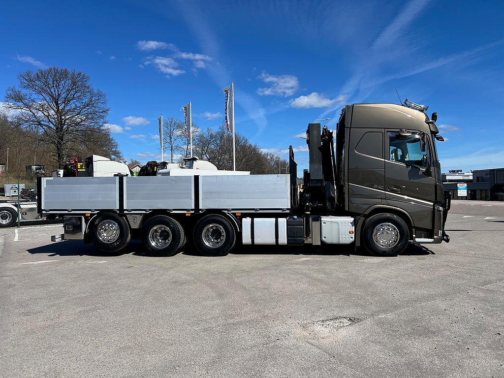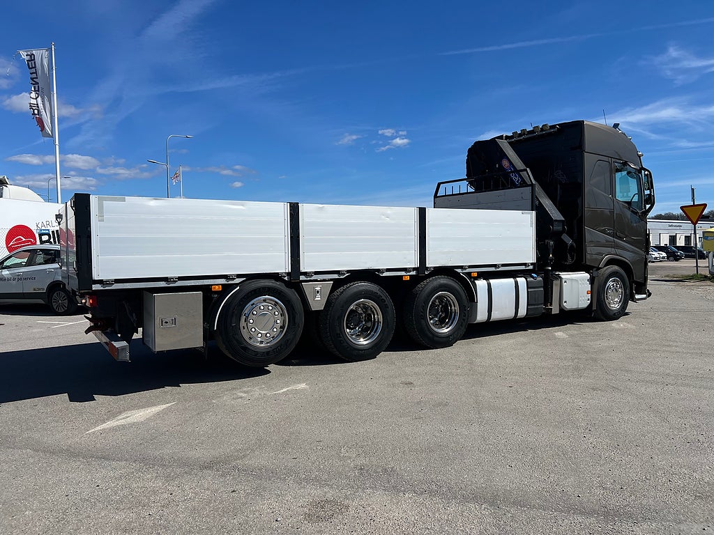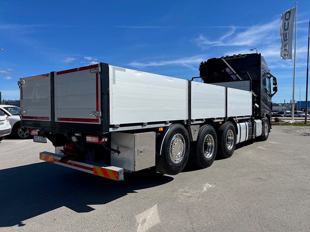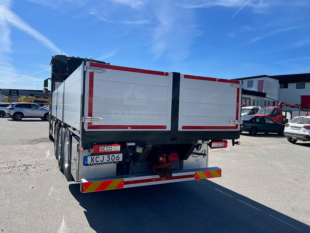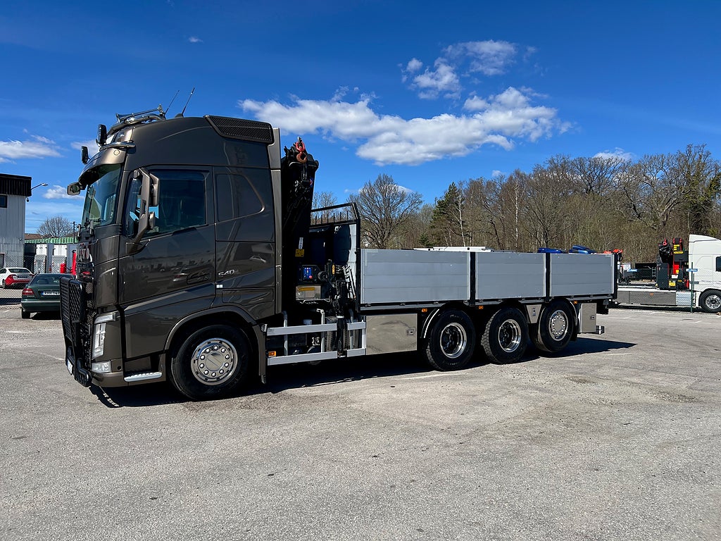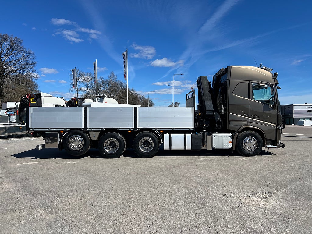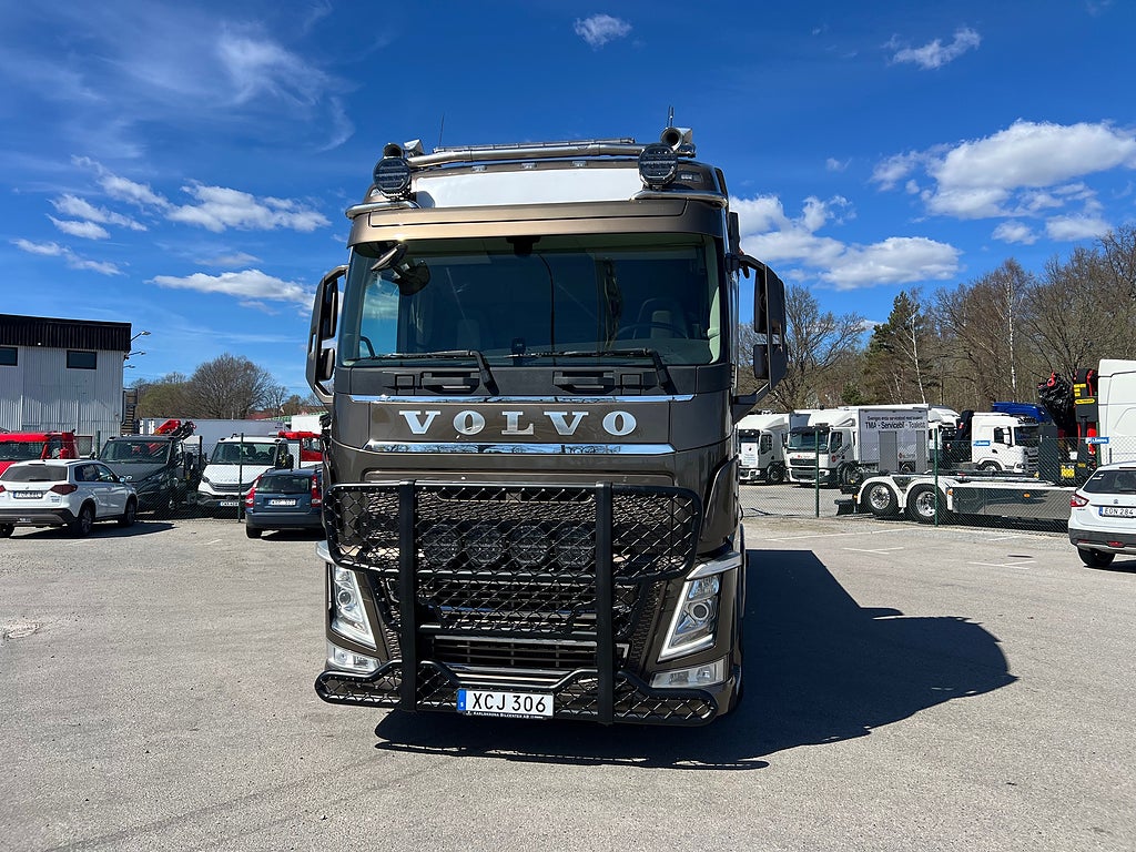 Förarpaket FH++, Siktpaket+, Extra hyttisolering FH Globetrotter, Interiör i mjuk textil i matchande grå/ beige toner stolklädsel i läder, Hög sovhytt FH (L2H2), Vil- och sovpaket Arctic+, Ljudpaket avancerat power, Taklucka i tonat glas elektrisk öppning, Extra ljudpaket 400 W slutsteg subwoofer, Multifunktionell fjärrkontroll, Brandvarnare, Elektronisk startspärr (immobilizer), Bi-Xenonlampor hel- och halvljus, Svart Älgstaket / Frontskydd med LED Extraljus, Assistansuppkoppling med mikrofon, TV-prep ovan vänster dörr, Förstärkt växellåda, 33 liters kylbox med frysdel under säng, Armstöd i läder, Stolklädsel läder i svart/grå färg, Bäddmadrass Premium, Luftfjädrad hyttfjädring, Vilstol sväng- och fällbar, Armstöd båda sidor förar- och passagerarstol, Förarstol lyx luftfjädrad med värme samt minnesfunktion, Kontrollpanel i sovhytt lyx, Boggielåda, Rostfri Takbåge med extraljus, HMF 2620 K7 Kran, 7 Stycken hydrauliska utskjut, Flakets invändiga mått är Längd: 651 Cm & Bredd: 247 Cm, Hjulbas 4100 mm, Tjänstevikt: 16 590 Kg, Tillåten Lastvikt: 15 410 Kg, Totalvikt: 32 000 Kg, Tågvikt: 70 000 Kg, Tridem Brädgårdsbil Kranbil Brädgårs bil Kran bil,