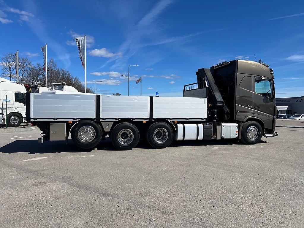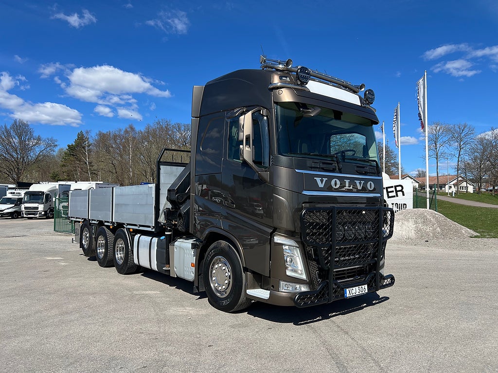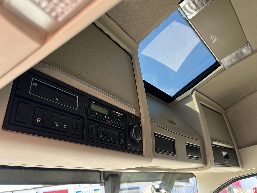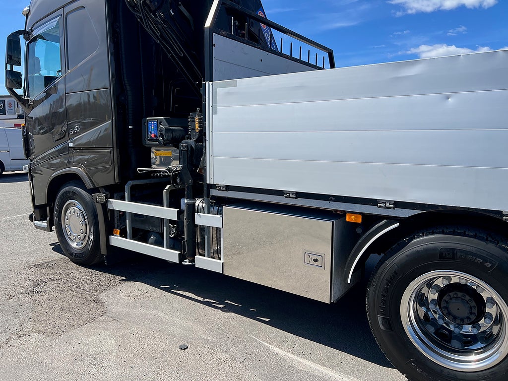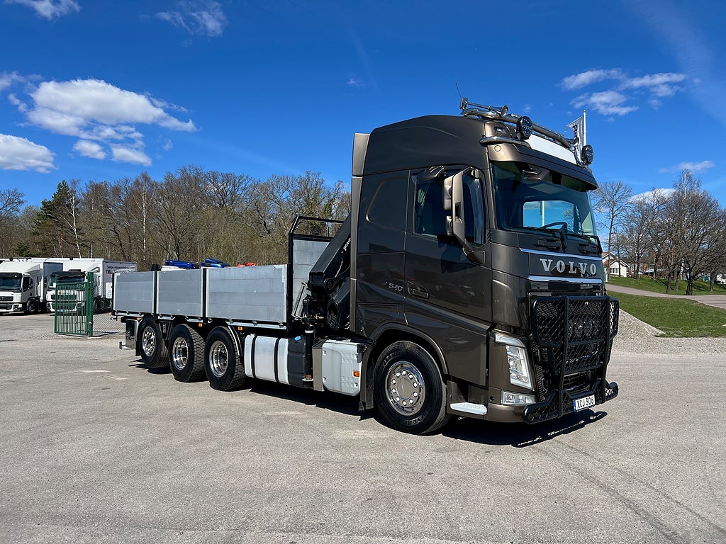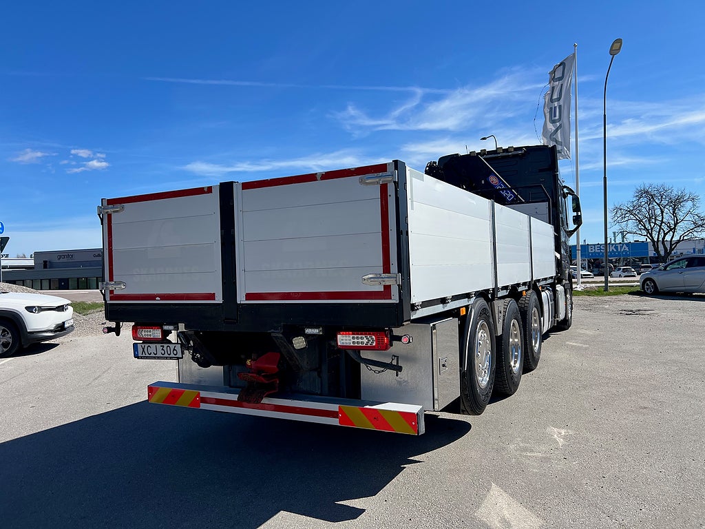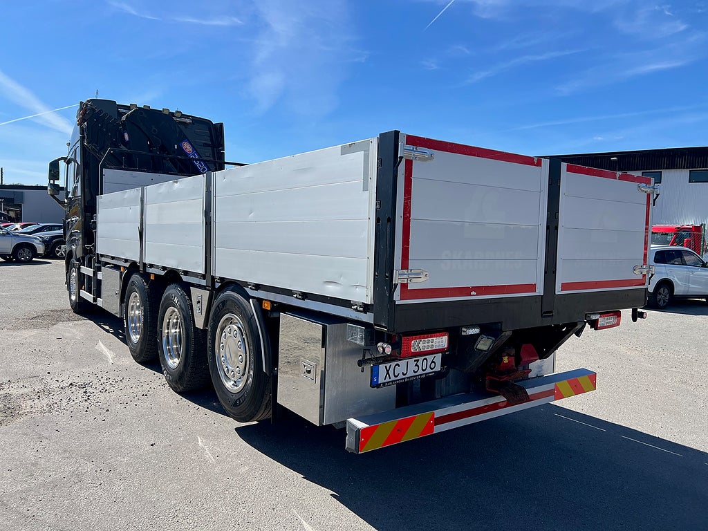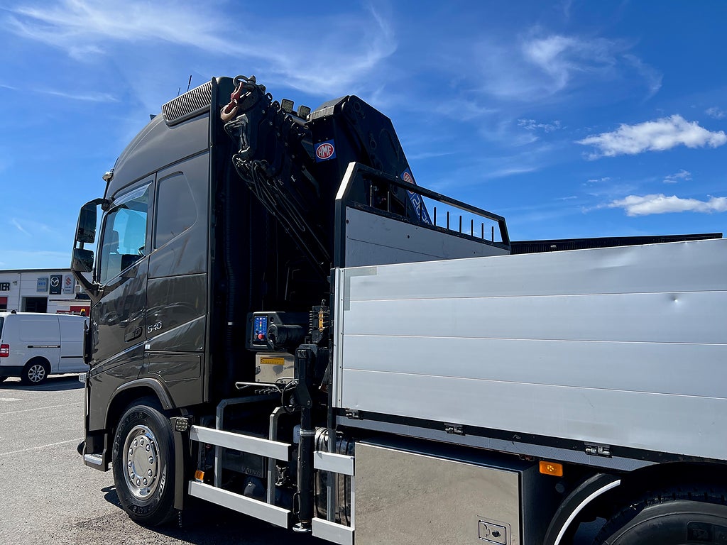 Förarpaket FH++, Siktpaket+, Extra hyttisolering FH Globetrotter, Interiör i mjuk textil i matchande grå/ beige toner stolklädsel i läder, Hög sovhytt FH (L2H2), Vil- och sovpaket Arctic+, Ljudpaket avancerat power, Taklucka i tonat glas elektrisk öppning, Extra ljudpaket 400 W slutsteg subwoofer, Multifunktionell fjärrkontroll, Brandvarnare, Elektronisk startspärr (immobilizer), Bi-Xenonlampor hel- och halvljus, Svart Älgstaket / Frontskydd med LED Extraljus, Assistansuppkoppling med mikrofon, TV-prep ovan vänster dörr, Förstärkt växellåda, 33 liters kylbox med frysdel under säng, Armstöd i läder, Stolklädsel läder i svart/grå färg, Bäddmadrass Premium, Luftfjädrad hyttfjädring, Vilstol sväng- och fällbar, Armstöd båda sidor förar- och passagerarstol, Förarstol lyx luftfjädrad med värme samt minnesfunktion, Kontrollpanel i sovhytt lyx, Boggielåda, Rostfri Takbåge med extraljus, HMF 2620 K7 Kran, 7 Stycken hydrauliska utskjut, Flakets invändiga mått är Längd: 651 Cm & Bredd: 247 Cm, Hjulbas 4100 mm, Tjänstevikt: 16 590 Kg, Tillåten Lastvikt: 15 410 Kg, Totalvikt: 32 000 Kg, Tågvikt: 70 000 Kg, Tridem Brädgårdsbil Kranbil Brädgårs bil Kran bil,