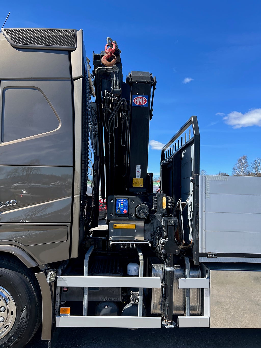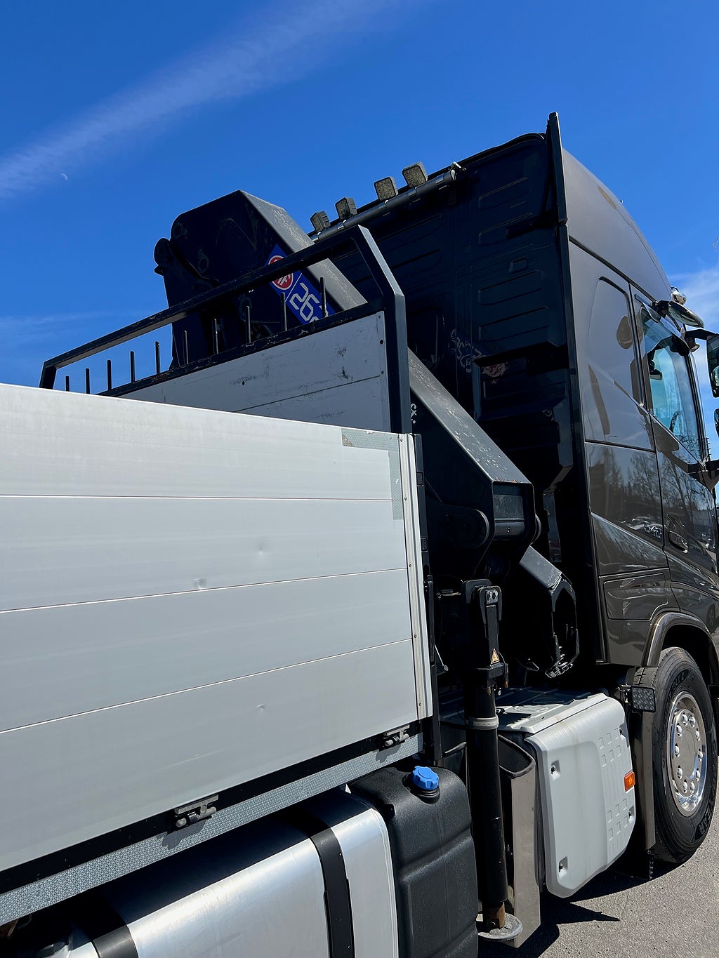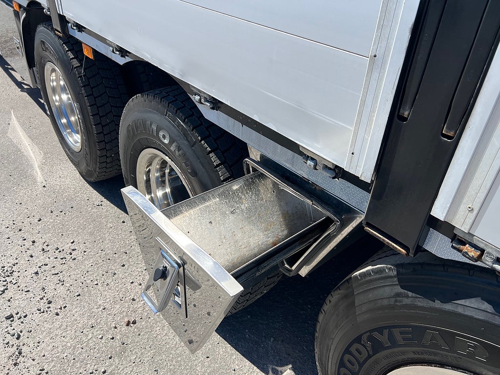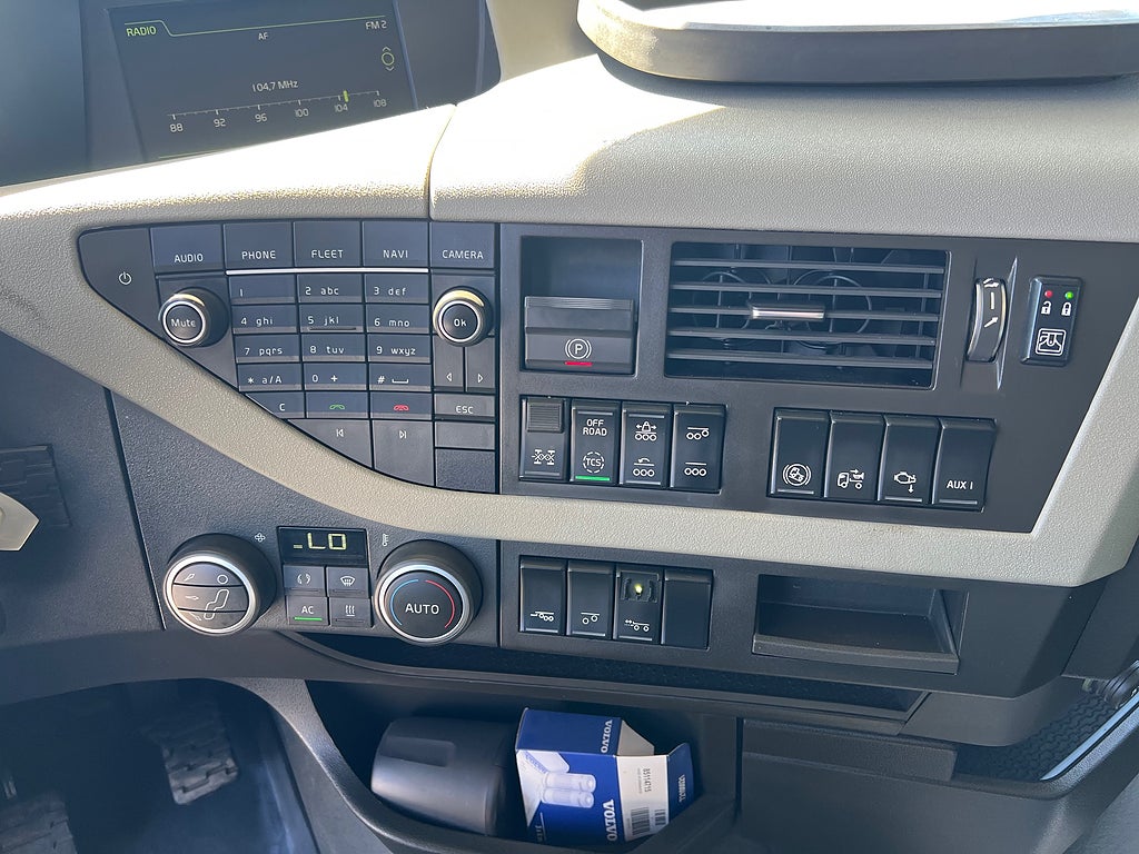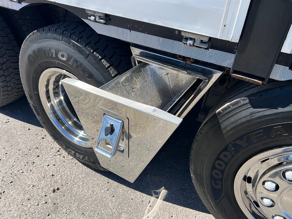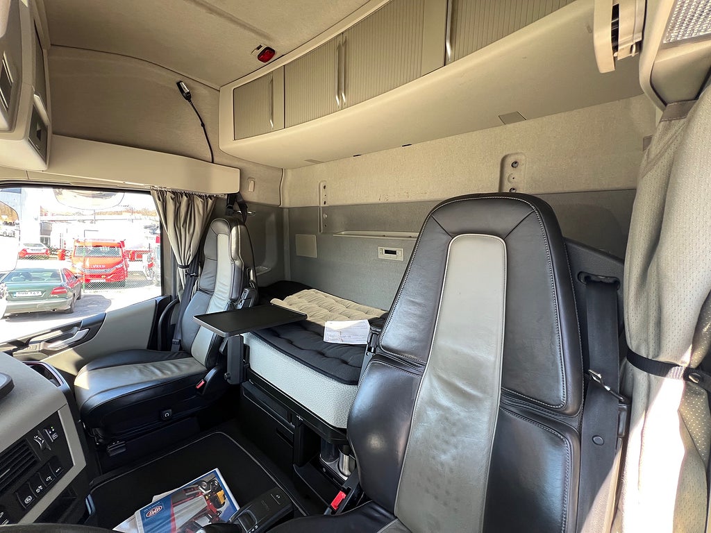 Förarpaket FH++, Siktpaket+, Extra hyttisolering FH Globetrotter, Interiör i mjuk textil i matchande grå/ beige toner stolklädsel i läder, Hög sovhytt FH (L2H2), Vil- och sovpaket Arctic+, Ljudpaket avancerat power, Taklucka i tonat glas elektrisk öppning, Extra ljudpaket 400 W slutsteg subwoofer, Multifunktionell fjärrkontroll, Brandvarnare, Elektronisk startspärr (immobilizer), Bi-Xenonlampor hel- och halvljus, Svart Älgstaket / Frontskydd med LED Extraljus, Assistansuppkoppling med mikrofon, TV-prep ovan vänster dörr, Förstärkt växellåda, 33 liters kylbox med frysdel under säng, Armstöd i läder, Stolklädsel läder i svart/grå färg, Bäddmadrass Premium, Luftfjädrad hyttfjädring, Vilstol sväng- och fällbar, Armstöd båda sidor förar- och passagerarstol, Förarstol lyx luftfjädrad med värme samt minnesfunktion, Kontrollpanel i sovhytt lyx, Boggielåda, Rostfri Takbåge med extraljus, HMF 2620 K7 Kran, 7 Stycken hydrauliska utskjut, Flakets invändiga mått är Längd: 651 Cm & Bredd: 247 Cm, Hjulbas 4100 mm, Tjänstevikt: 16 590 Kg, Tillåten Lastvikt: 15 410 Kg, Totalvikt: 32 000 Kg, Tågvikt: 70 000 Kg, Tridem Brädgårdsbil Kranbil Brädgårs bil Kran bil,