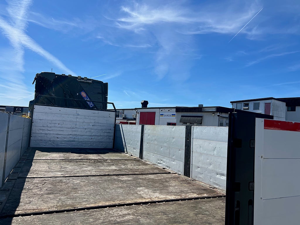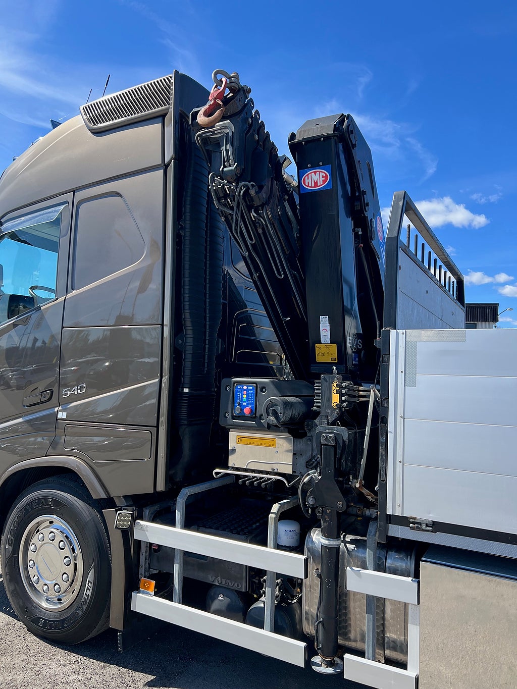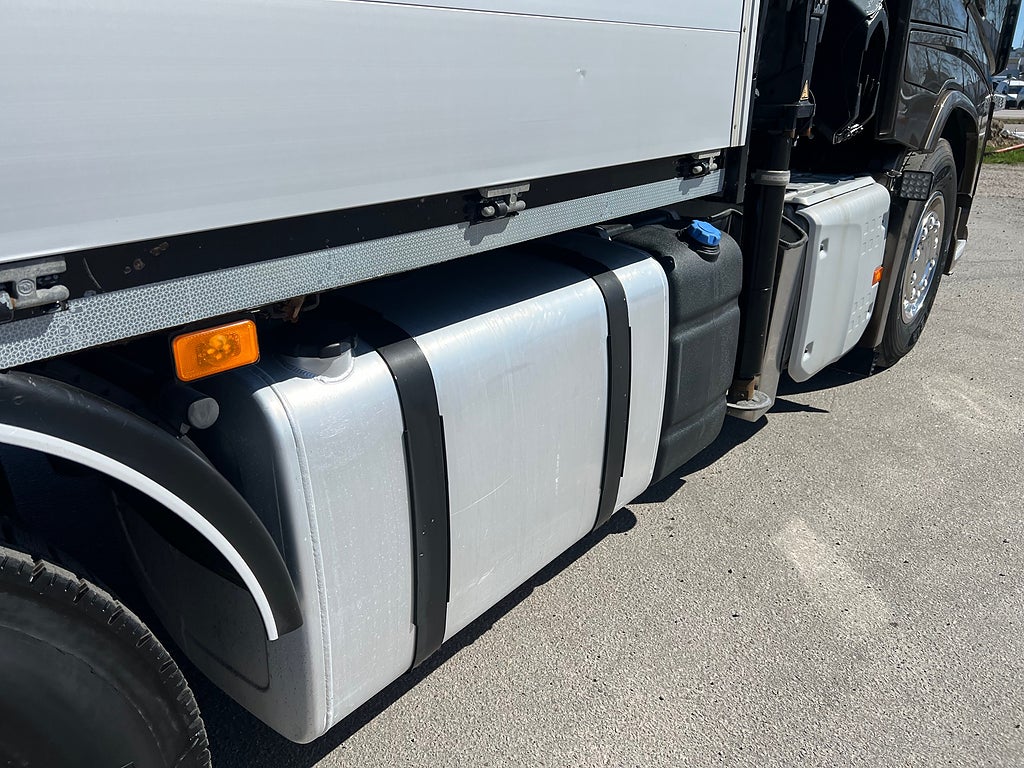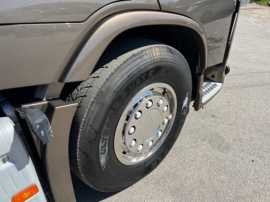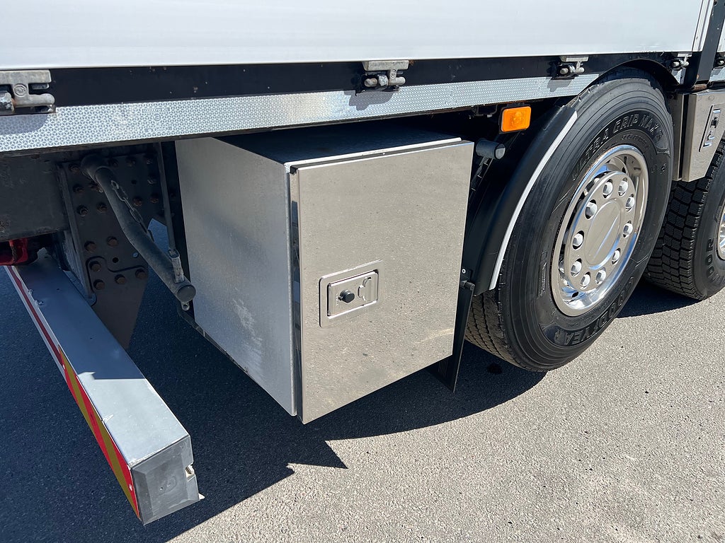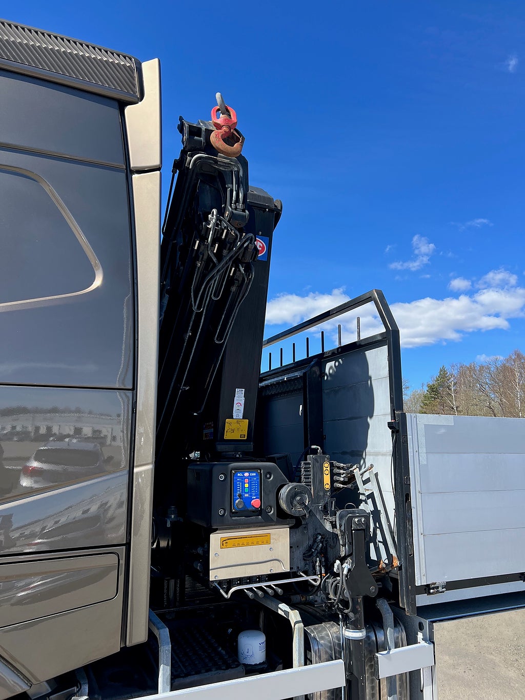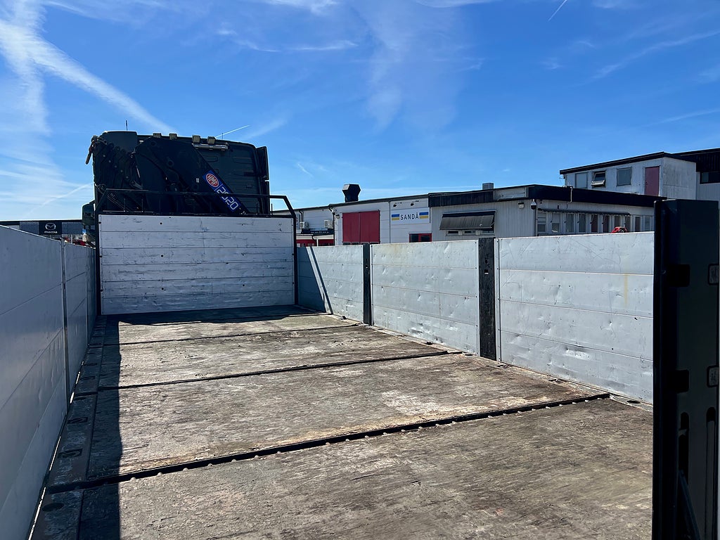 Förarpaket FH++, Siktpaket+, Extra hyttisolering FH Globetrotter, Interiör i mjuk textil i matchande grå/ beige toner stolklädsel i läder, Hög sovhytt FH (L2H2), Vil- och sovpaket Arctic+, Ljudpaket avancerat power, Taklucka i tonat glas elektrisk öppning, Extra ljudpaket 400 W slutsteg subwoofer, Multifunktionell fjärrkontroll, Brandvarnare, Elektronisk startspärr (immobilizer), Bi-Xenonlampor hel- och halvljus, Svart Älgstaket / Frontskydd med LED Extraljus, Assistansuppkoppling med mikrofon, TV-prep ovan vänster dörr, Förstärkt växellåda, 33 liters kylbox med frysdel under säng, Armstöd i läder, Stolklädsel läder i svart/grå färg, Bäddmadrass Premium, Luftfjädrad hyttfjädring, Vilstol sväng- och fällbar, Armstöd båda sidor förar- och passagerarstol, Förarstol lyx luftfjädrad med värme samt minnesfunktion, Kontrollpanel i sovhytt lyx, Boggielåda, Rostfri Takbåge med extraljus, HMF 2620 K7 Kran, 7 Stycken hydrauliska utskjut, Flakets invändiga mått är Längd: 651 Cm & Bredd: 247 Cm, Hjulbas 4100 mm, Tjänstevikt: 16 590 Kg, Tillåten Lastvikt: 15 410 Kg, Totalvikt: 32 000 Kg, Tågvikt: 70 000 Kg, Tridem Brädgårdsbil Kranbil Brädgårs bil Kran bil,